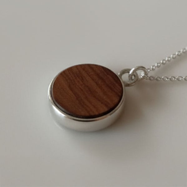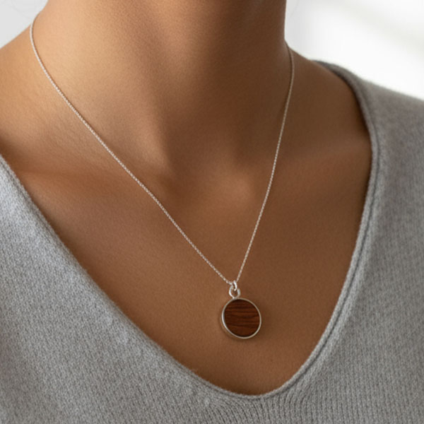 Colgante ovalado de gran formato en madera de olivo y plata reciclada, diseño orgánico y femenino.