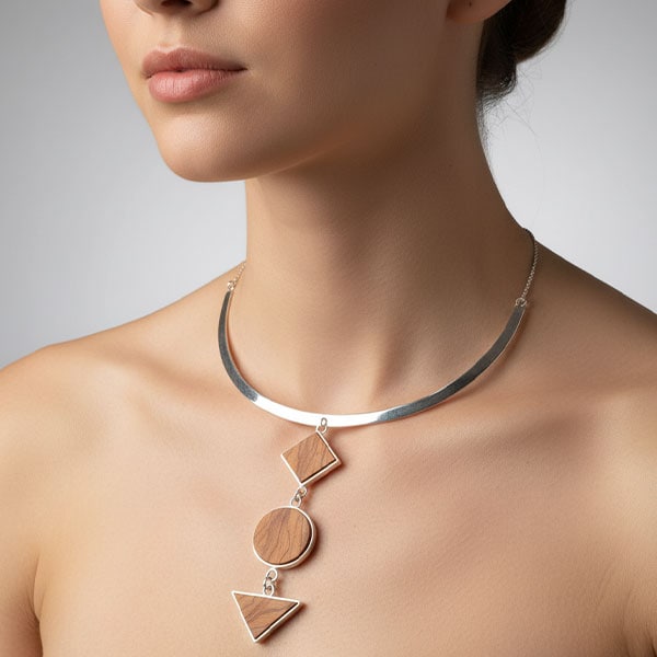 Colgante ovalado de gran formato en madera de olivo y plata reciclada, diseño orgánico y femenino.