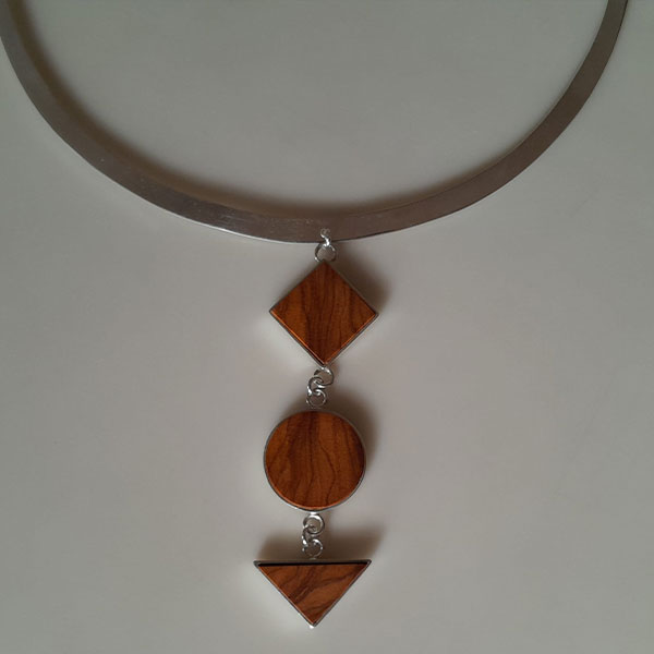 Colgante para mujer con dos formas de lágrima en madera de olivo y plata reciclada, elegante y femenino.
